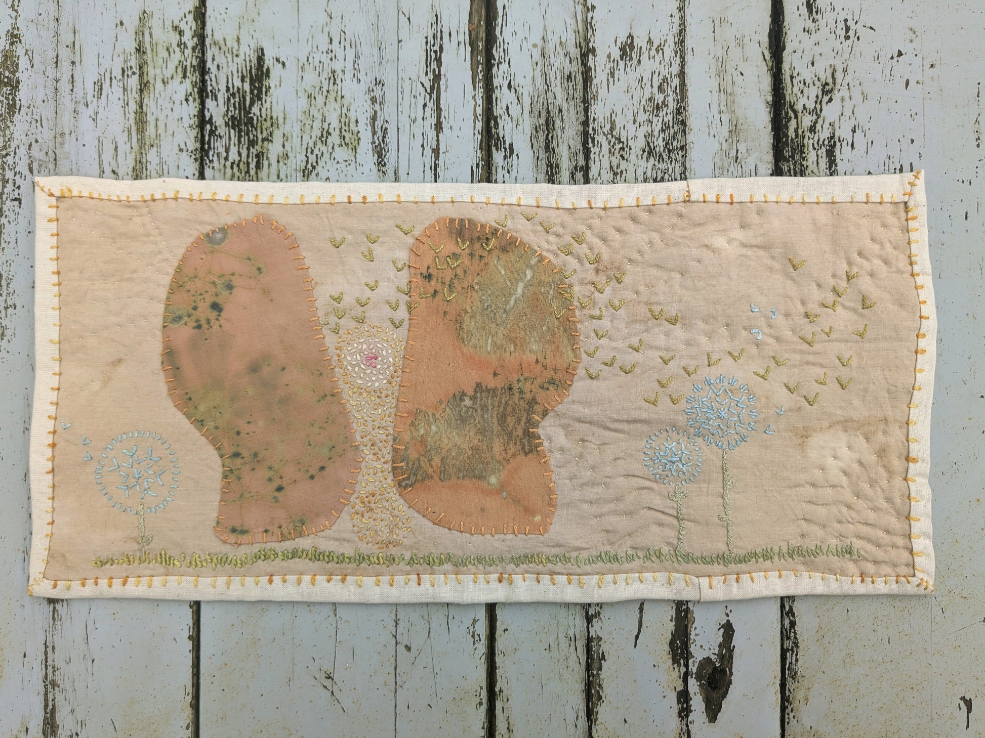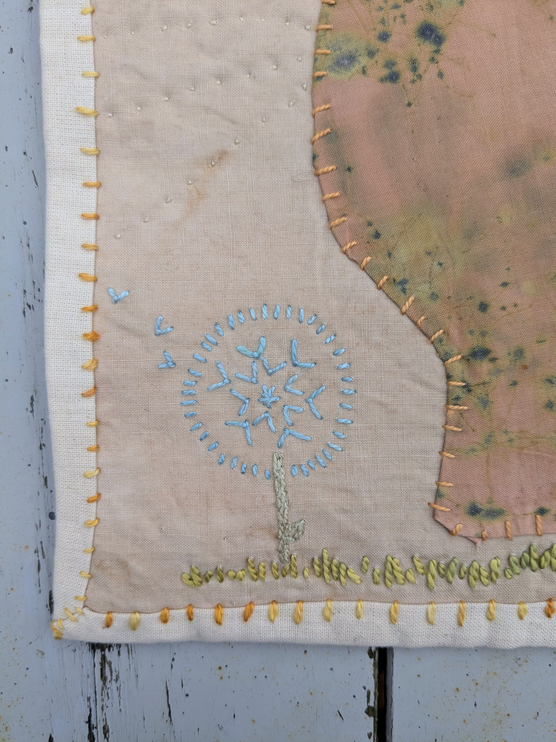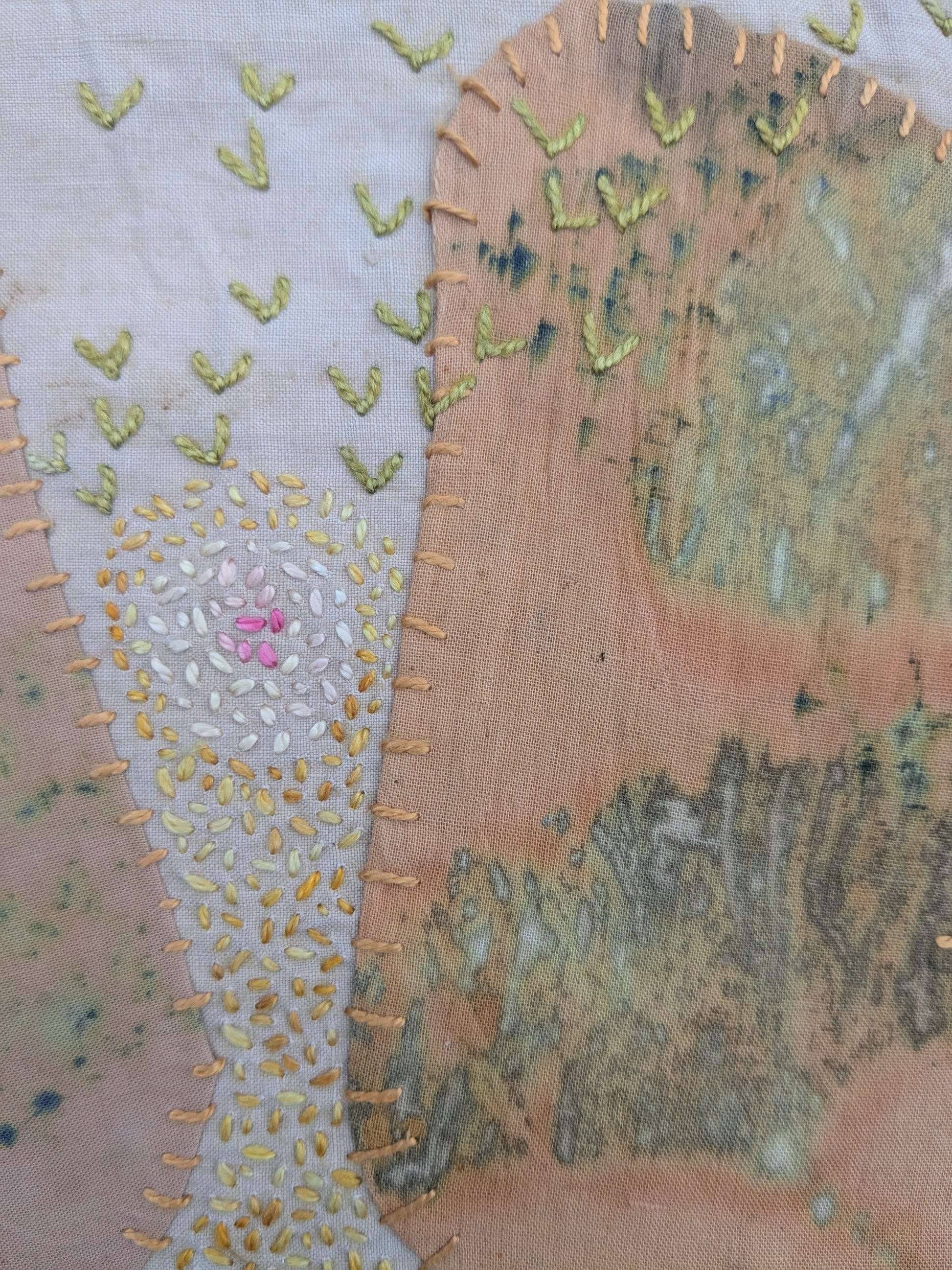 handstitched mini eco-printed art quilt, created using scraps of eco-printed fabric and naturally dyed threads.